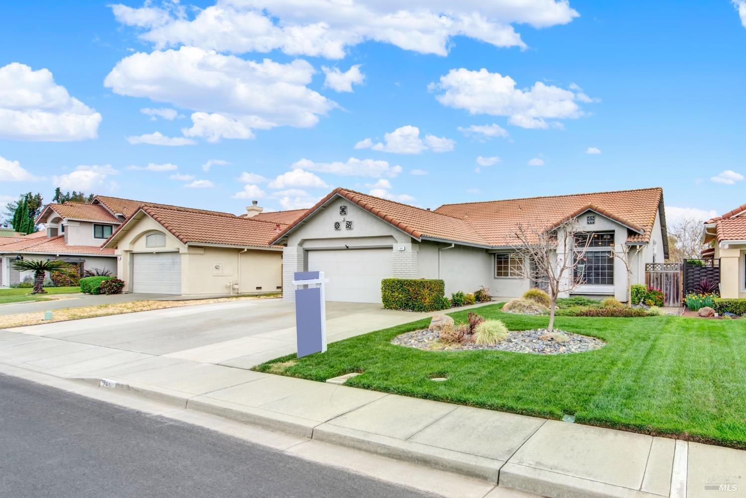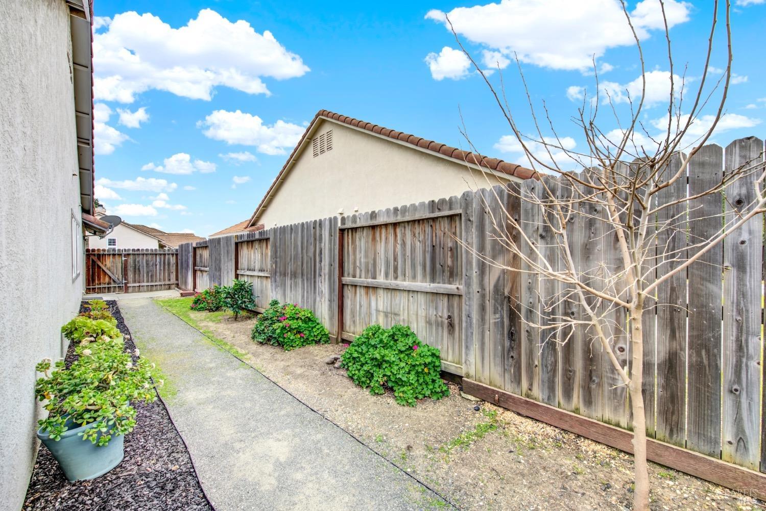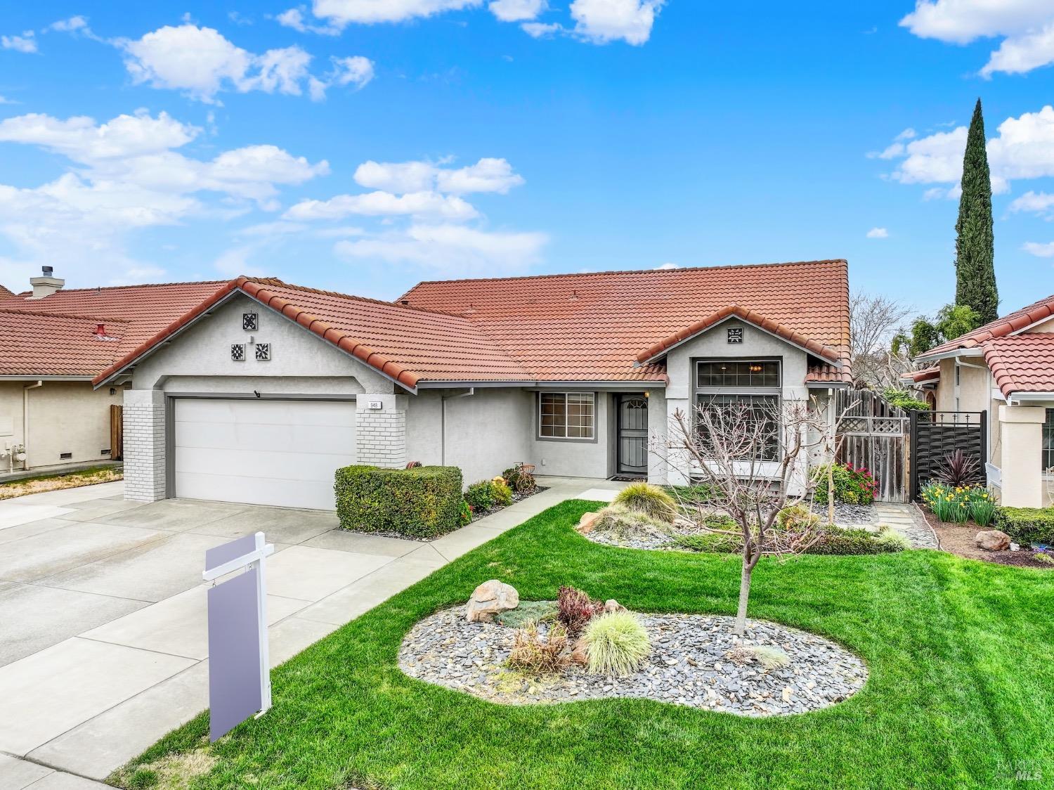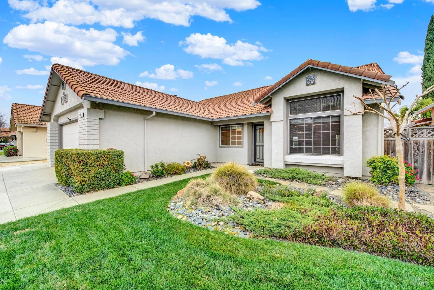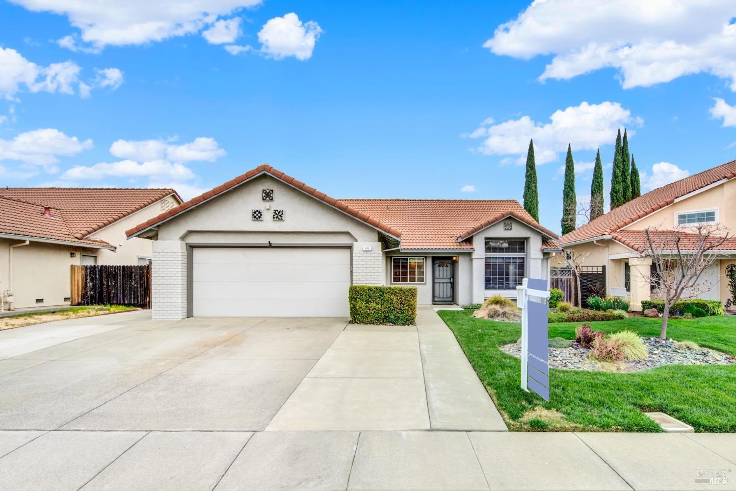 This move-in-ready 4-bed, 2-bath single story home in Vacaville's Foxwood subdivision offers 1,791 sq. ft. of living space, with soaring ceilings and bright natural light. Features include a spacious kitchen with granite countertops, recessed lighting, and new carpet in the bedrooms. Recent updates include a new hot water heater, HVAC system (5 yr), garage door & opener (2 yr), and exterior paint (6 yr). Enjoy easy-care laminate flooring in main living areas, a tile roof, and upgraded front and rear landscaping with sprinklers. The primary suite boasts a vaulted ceiling, double closets, plus an extra-large shower and granite counters in the updated primary bathroom. The garage comes with cabinetry and a workbench. The driveway is extra wide for lots of parking options. Located near parks, schools, and with easy access to I-80, this home is in the highly-rated Travis Unified School District and just 15 minutes from Travis AFB. A must-see! Pest & Roof Clearance repairs will be completed 3/1. 4th bedroom has double doors but no closet. It also makes for a great office or 3rd living area. Fruit trees in backyard for homemade lemonade!